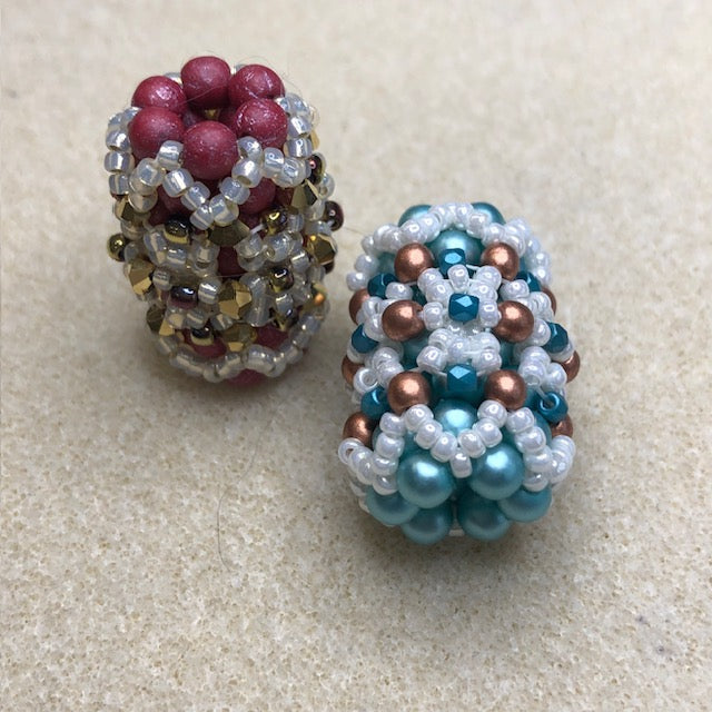 This tubular bead has no internal support. You create a base of beads and then top that base with various embellishments. You will be doing cubic right angle weave, netting and some zipping.